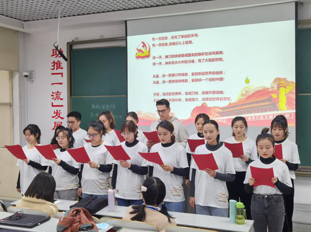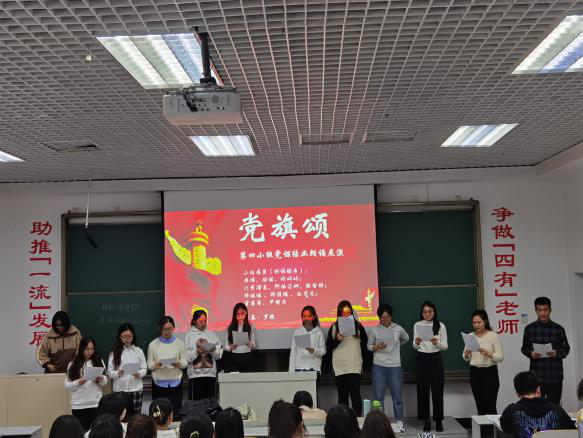 第五组的同学们为大家带来了诗朗诵《红船从南湖启航》,展现了党的历史重要节点,提现了对党的忠诚与热爱;第六组全体同学带来了诗朗诵《党旗颂》,感情充沛,铿锵有力,展现了加入中国共产党的决心。第八组同学全员身着白衬衣,带来了诗朗诵《我的祖国》,自信且深情地表达了对祖国的热爱。
