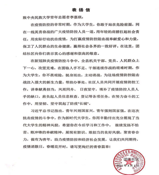 在新冠疫情防控的前沿阵地上,我院学子积极响应党和国家的号召,用年轻的肩膀扛起社会责任,为打赢疫情防控阻击战奉献爱心和力量,赢得社会各界的好评。在当地党委政府的统一指挥下,他们有序参与疫情防控工作,以无私的奉献为所在城市增添了更多暖色,当地对我院学子不惧风险、迎难而上投身家乡疫情防控表示最诚挚的感谢和崇高的敬意,并致以感谢信和表彰证书。