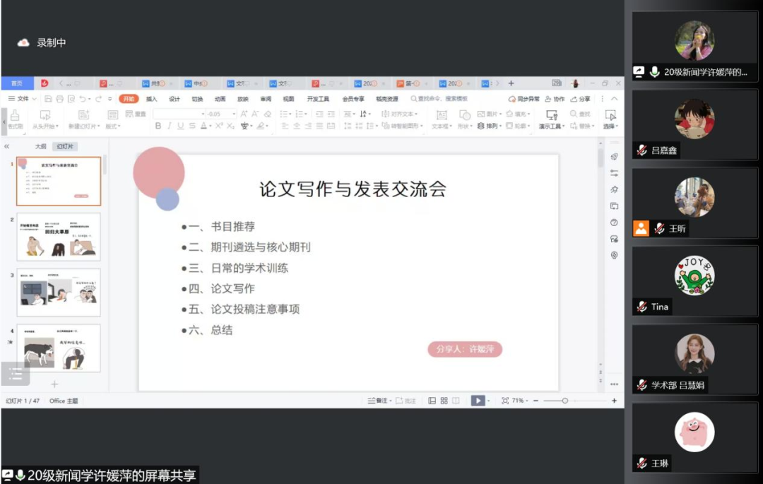 4月12日下午,由william威廉中文官网研究生会主办的“启智润新”学术论文写作沙龙第一场——“期刊论文专场”通过腾讯会议在云端顺利举办。学术论文写作沙龙活动旨在搭建学术沟通桥梁,营造良好学术氛围,提升我院研究生的学术水平和创新能力。本次活动有60余名同学参会。
