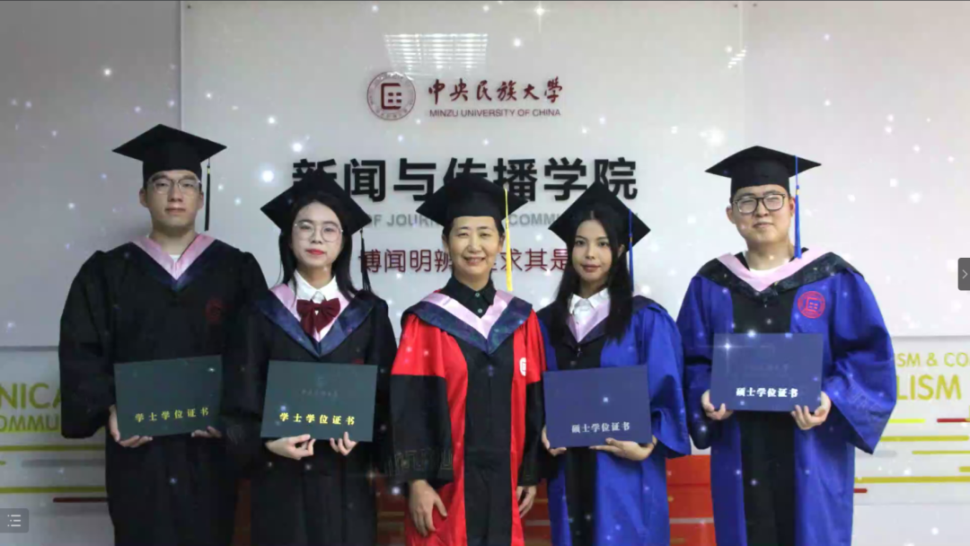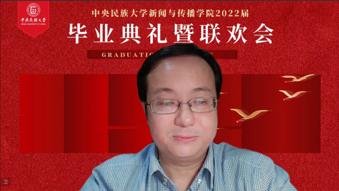 教师代表刘瑾鸿教授说,自从疫情以来,世界就被切割成了两个部分,线上的赛博空间和线下的物理世界,虽然只能以线上举行毕业典礼,但是大家曾经共居一堂的具身世界有我们师生全部安放的身心,有我们更深切的感受和情谊,老师们将永远在美丽的民大校园等候同学们未来相聚,祝愿天南海北的同学们都能有一个丰盈充实的人生。