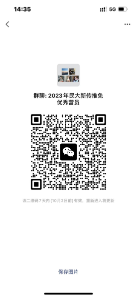 各位已获今年夏令营优秀营员资格的同学:为方便推免录取工作开展,请于2023年9月26日中午12点前,扫描下方二维码入群。入群后请更改群昵称为“专业+姓名+手机号”,谢谢!学院将第一时间通过本群发送推免录取的相关通知。