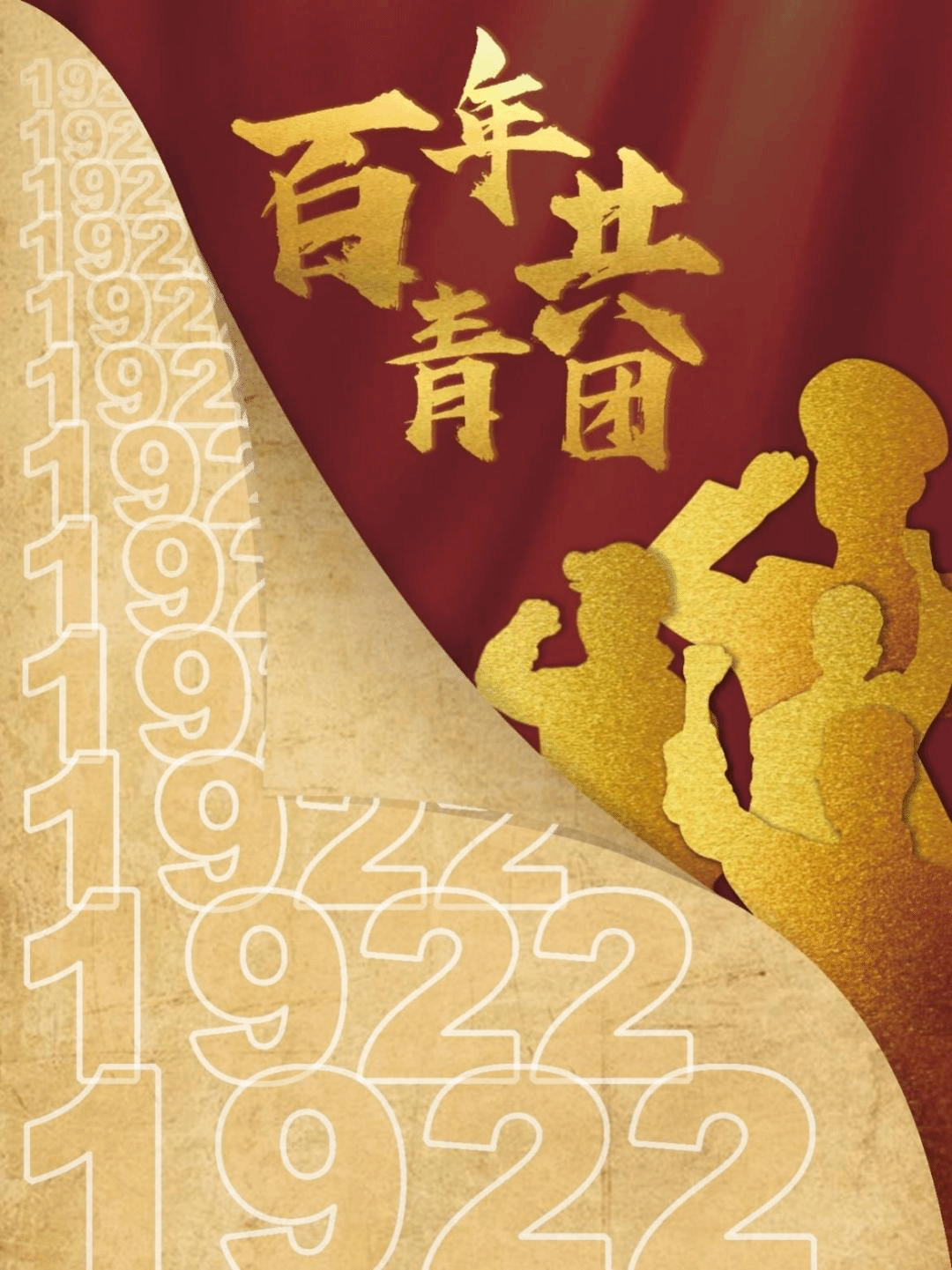 简介:海报模拟了书本翻页的形象,象征中国共青团的百年新篇章。旧书页模拟了牛皮纸的质感,由“1922”组成的数字阶梯,象征着共青团拾级而上,在百年历程中步步向前。右侧的人物剪影是百年来的有志青年为了新中国而不懈奋斗的代表,“百年共青团”醒目而点题。