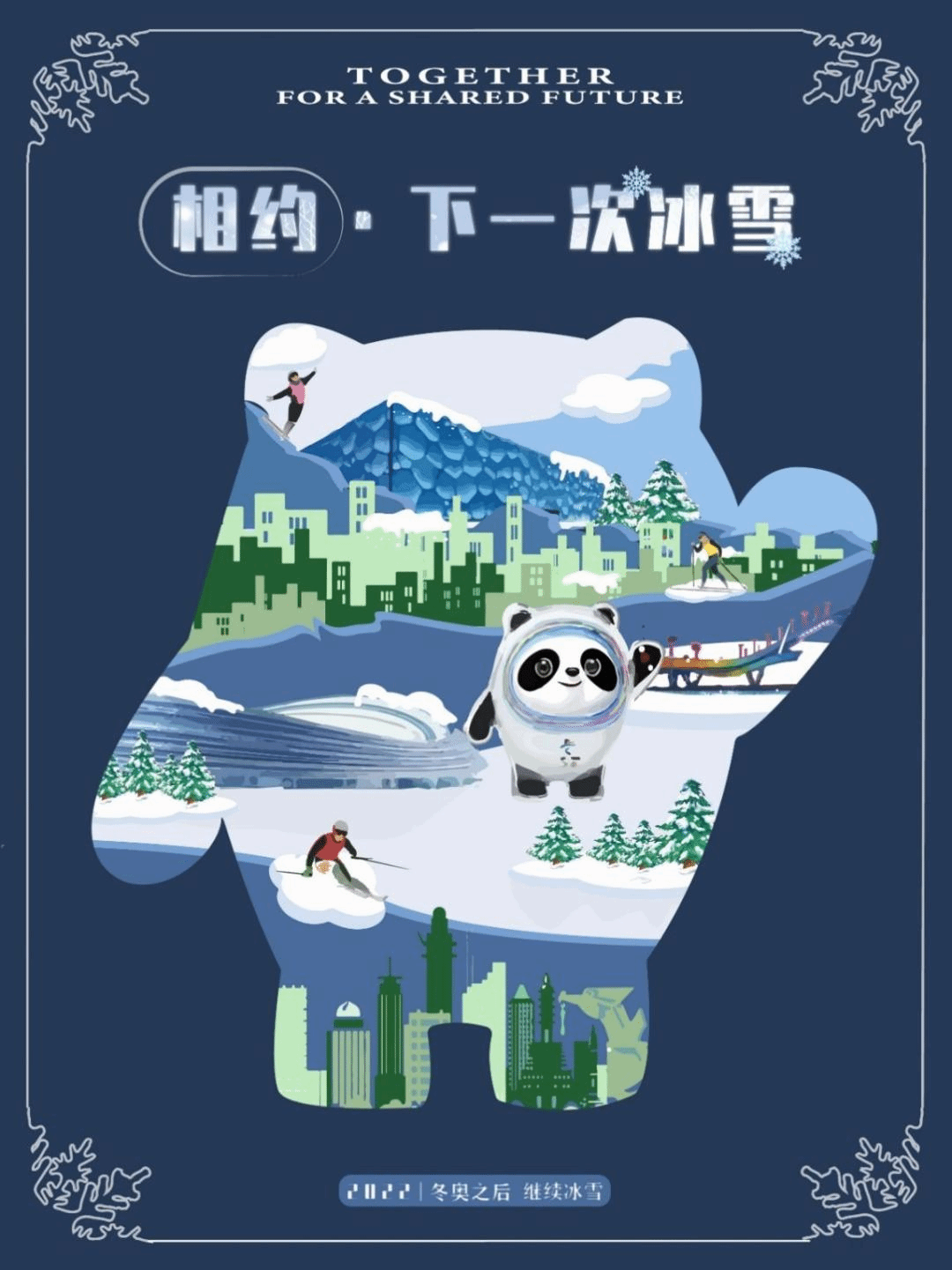 简介:主体是冰墩墩的剪影,采用了冬奥的三个场馆——冰丝带、首钢滑雪大跳台和冰立方,冬奥吉祥物冰墩墩,以及在进行冰雪运动的人物动作作为主要元素。四周为冰雪条纹做的边框。表达主题:相约·下一次冰雪,冬奥虽然结束了,但是冰雪运动的精神会一直持续。