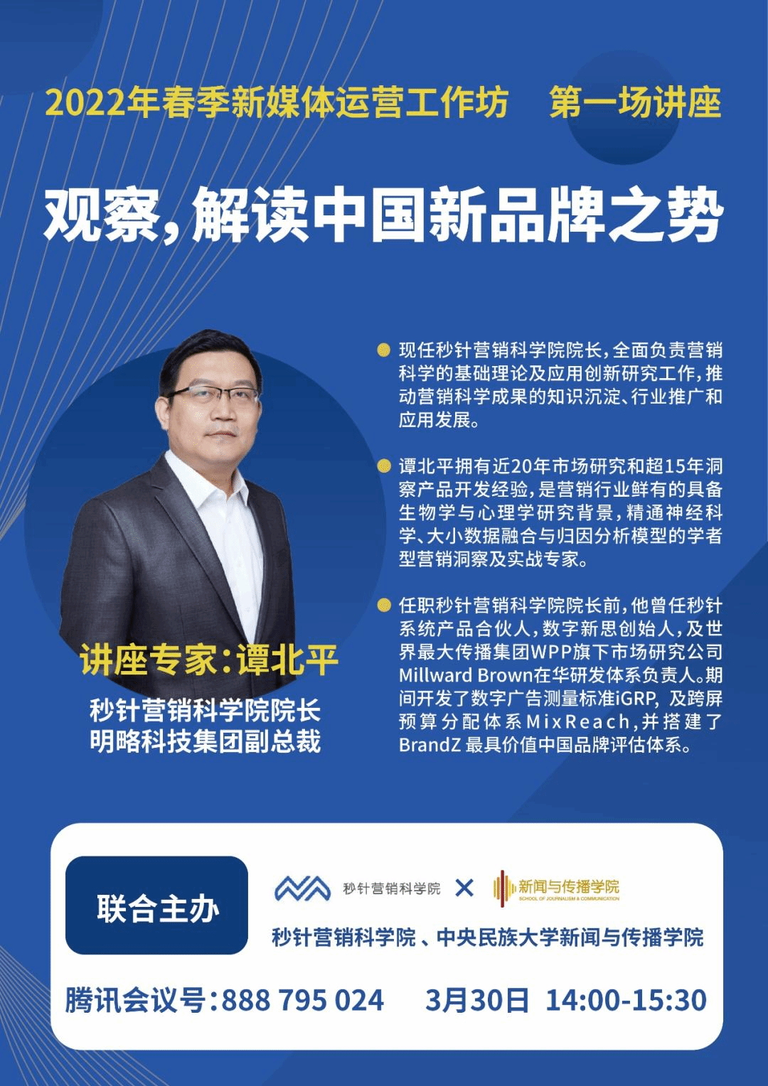 从本学期开始,中央民族大学william威廉中文官网联合秒针营销科学院将共同打造数字创新教学研究合作项目,项目依托于2022年春季学期“新媒体运营工作坊”课程推出系列讲座,与民大新传的师生共同分享业界前沿技术、数字营销理念和数据治理经验。敬请关注。